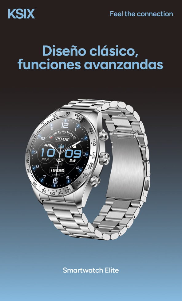 El KSIX Elite es la fusión perfecta entre diseño clásico y últimas prestaciones. Su pantalla AMOLED de 1.43" ofrece una visualización nítida y vibrante, mientras que la aleación de zinc y la correa de acero aportan un acabado sofisticado y resistente. Con una autonomia de hasta 7 días te acompaña con estilo mientras cuidas tu salud, practicas deporte y gestionas tu día a día.