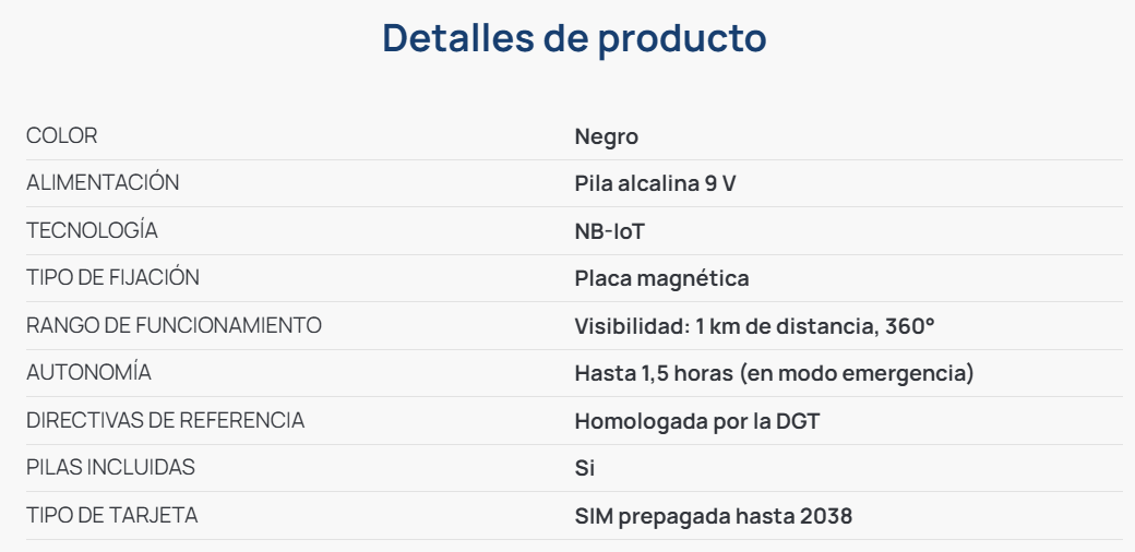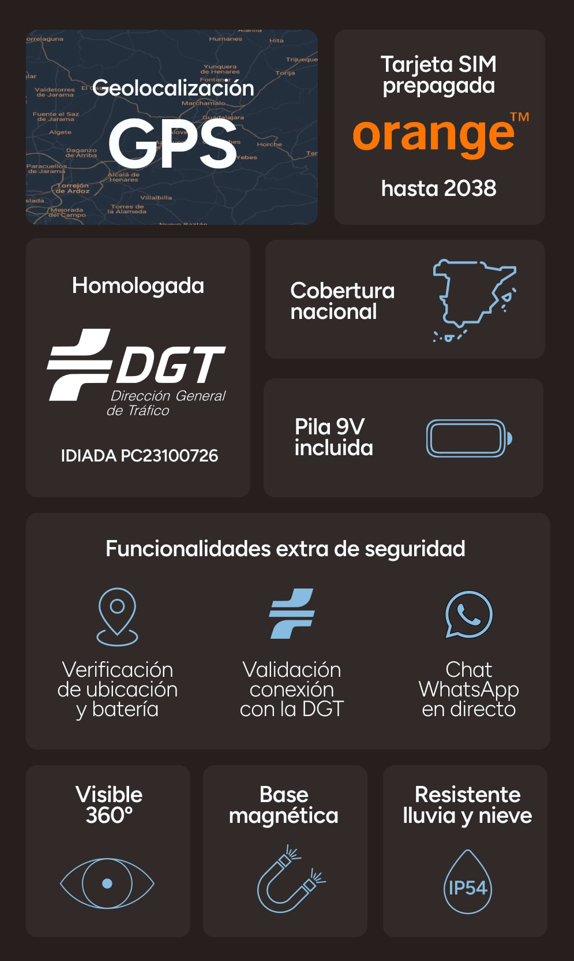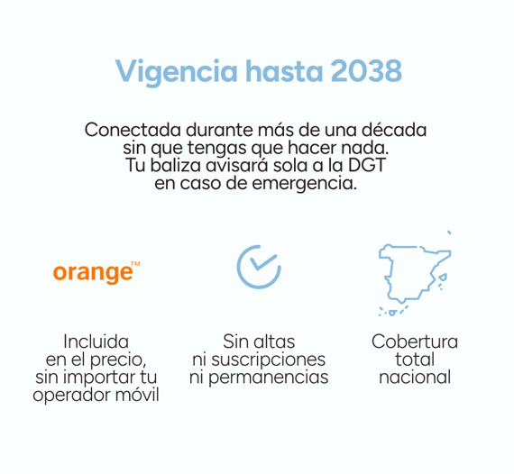 Con esta luz de emergencia podrás sentirte seguro ante cualquier avería o accidente. La tecnología NB-IoT que incorpora esta luz, proporciona una cobertura especial permitiendo operar en sitios con señal escasa. Dispone de geolocalización y una Nano SIM prepagada Orange, con vigencia de más de 12 años (activable antes de 2026 con vigencia hasta 2038), que avisarán automáticamente a las autoridades e informarán de tu geolocalización al resto de usuarios mediante conexión DGT 3.0.