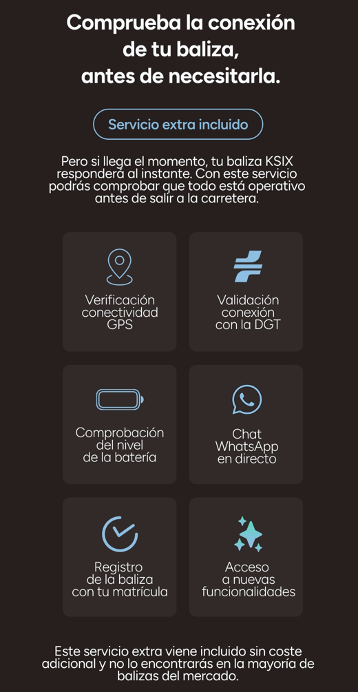 Esperamos que nunca tengas que usarla, pero este servicio exclusivo incluido con tu baliza KSIX te permite comprobar que todo funciona correctamente antes de cualquier emergencia. Solo escanea el código QR del packaging y podrás verificar la conexión GPS, el nivel de batería, la vinculación con la DGT y dar de alta tu matrícula. Una funcionalidad que otras balizas no ofrecen, pensada para que conduzcas con la confianza de saber que tu seguridad está lista y comprobada.