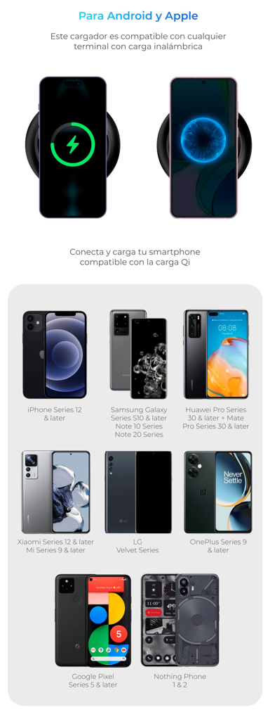 La base de carga inalámbrica KSIX Fast Charge ofrece una carga rápida con una potencia de hasta 15 W que te permitirá cargar a toda velocidad tu smartphone y auriculares compatibles mediante la tecnología inalámbrica Qi. Esta tecnología de carga es compatible con modelos de smartphone como iPhone 8 Series y posteriores; Huawei P30, P40 y P50 Series y posteriores; y Xiaomi Mi 9 Series y posteriores. Además, también es compatible con auriculares como AirPods Series 2, Pro Series y posteriores; y Nothing Ear 1, 2 y posteriores.
