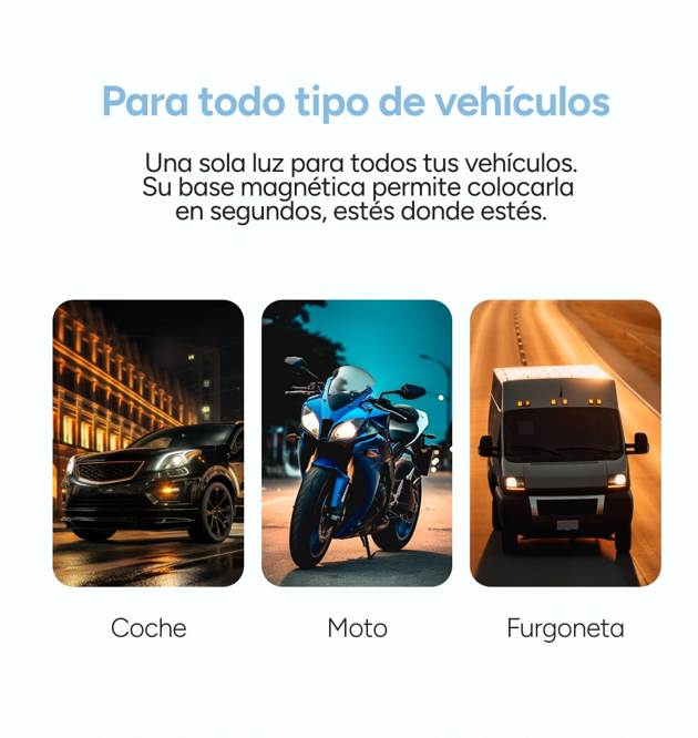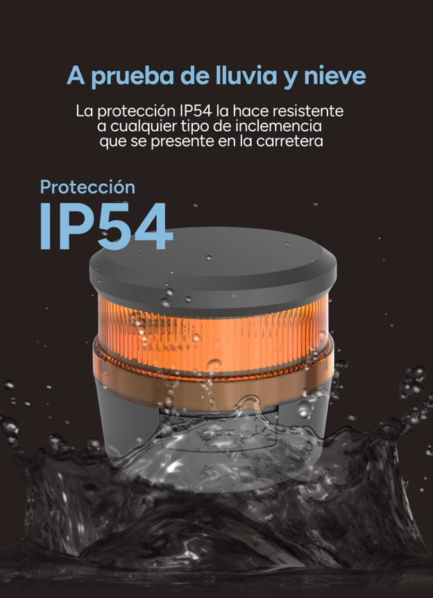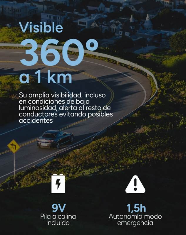 La luz ámbar que emite es visible hasta 1 km de distancia en 360°, por lo que no solo te protege a ti al darte visibilidad, sino que también al resto de conductores para evitar posibles accidentes. Podrás fijarla fácilmente en tu vehículo o en las biondas de la carretera gracias a la placa magnética que incorpora. Porque en la carretera lo más importante es la seguridad.
