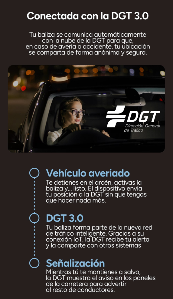 Con esta luz de emergencia podrás sentirte seguro ante cualquier avería o accidente. La tecnología NB-IoT que incorpora esta luz, proporciona una cobertura especial permitiendo operar en sitios con señal escasa. Dispone de geolocalización y una Nano SIM prepagada Orange, con vigencia de más de 12 años (activable antes de 2026 con vigencia hasta 2038), que avisarán automáticamente a las autoridades e informarán de tu geolocalización al resto de usuarios mediante conexión DGT 3.0.