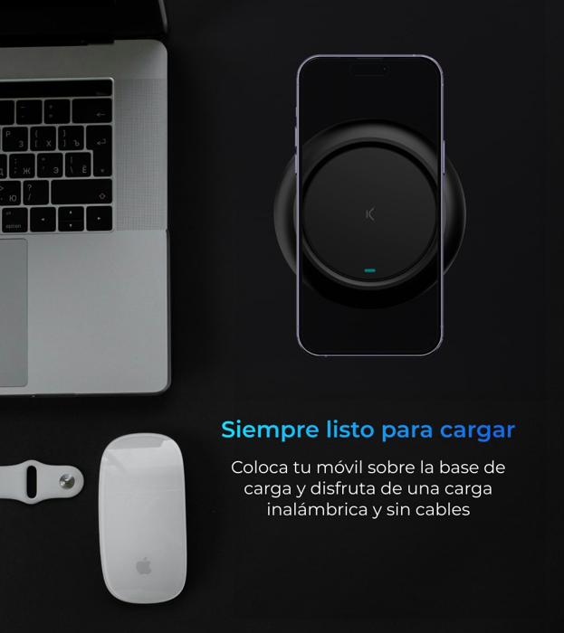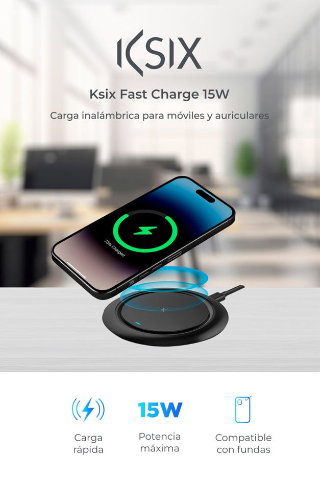 La base de carga inalámbrica KSIX Fast Charge ofrece una carga rápida con una potencia de hasta 15 W que te permitirá cargar a toda velocidad tu smartphone y auriculares compatibles mediante la tecnología inalámbrica Qi. Esta tecnología de carga es compatible con modelos de smartphone como iPhone 8 Series y posteriores; Huawei P30, P40 y P50 Series y posteriores; y Xiaomi Mi 9 Series y posteriores. Además, también es compatible con auriculares como AirPods Series 2, Pro Series y posteriores; y Nothing Ear 1, 2 y posteriores.
