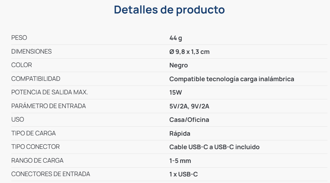 La base de carga Fast Charge cuenta con un diseño minimalista en color negro que se integra con facilidad en cualquier mesita de noche, mesa o escritorio. Además, cuenta unas dimensiones reducidas de tan solo 9,8 x 1,3 centímetros y un peso ultraligero de 44 gramos para ocupar el mínimo espacio posible. Incorpora un indicador LED que te informa sobre si el dispositivo que has colocado en la base de carga se está cargando o no. Incluye un cable USB-C a USB-C de 1 metro de longitud para mayor conveniencia.