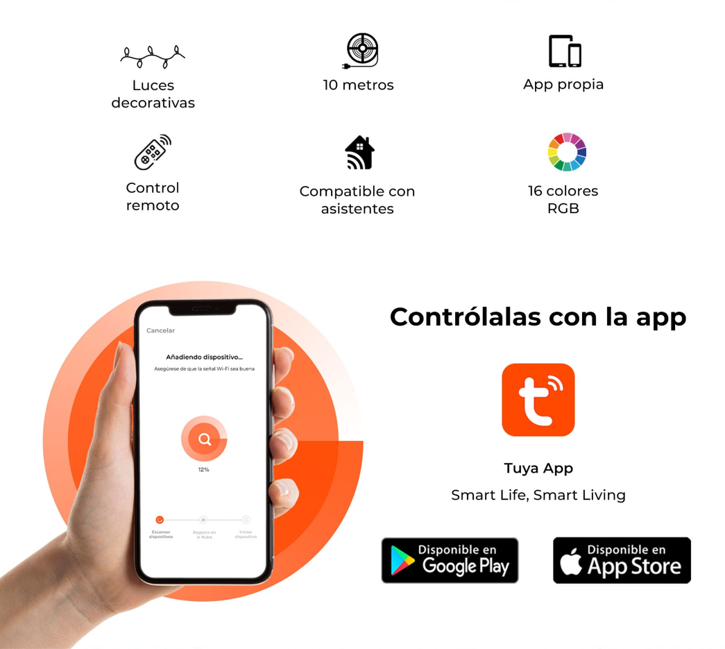 • 📱 Control por App (color, brillo, modos, temporizador)