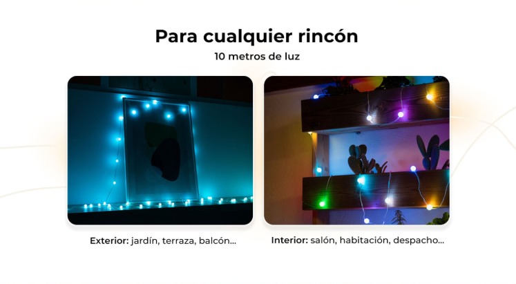 Su diseño flexible y su protección IP65 la hacen perfecta tanto para interiores como para exteriores cubiertos, ideal para decorar terrazas, habitaciones, eventos, escaparates o celebraciones especiales.